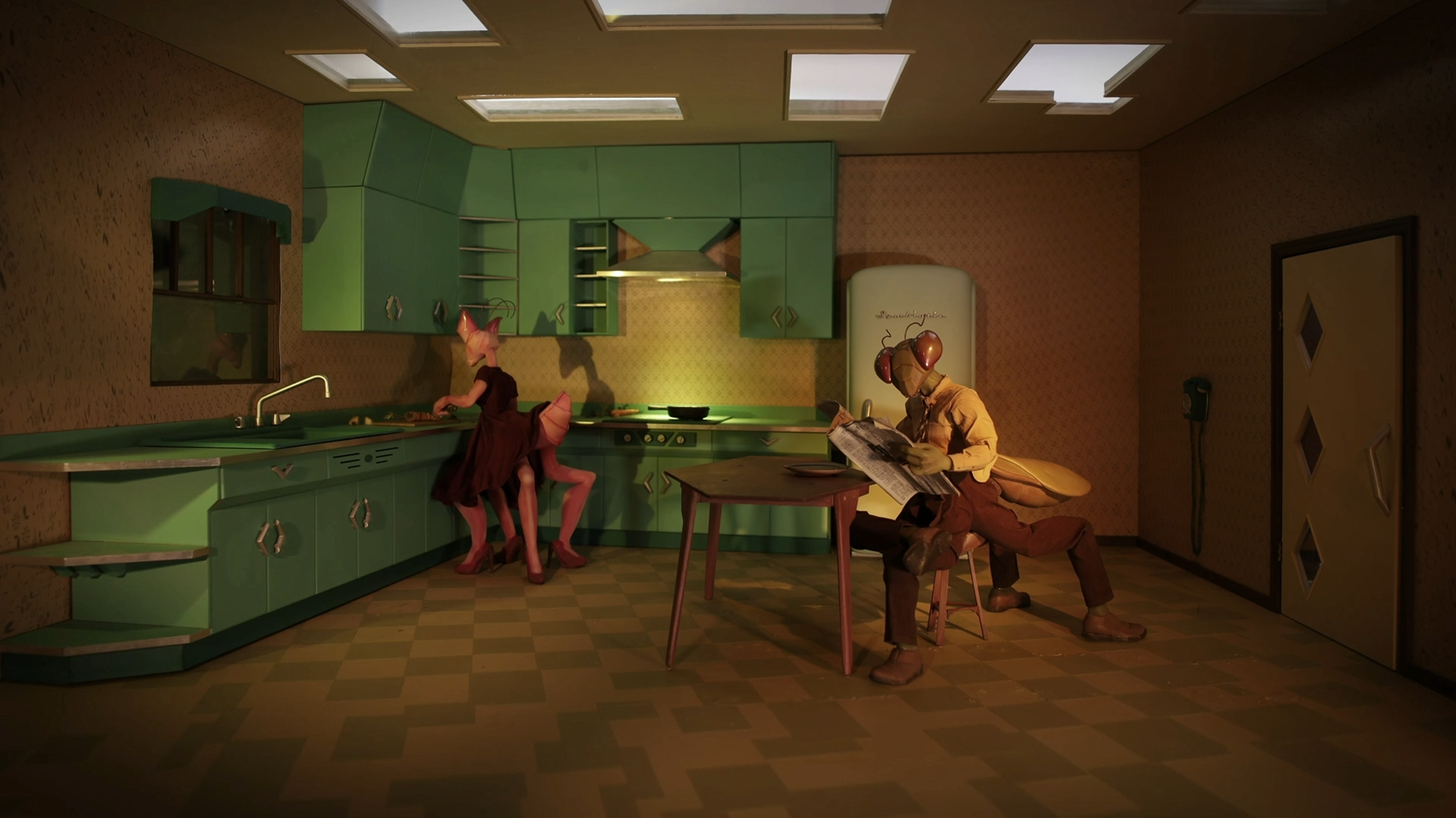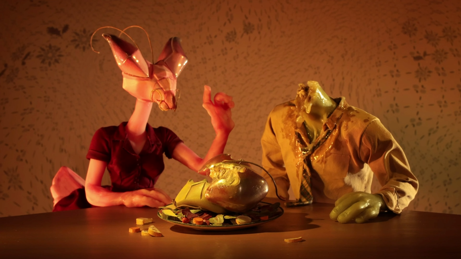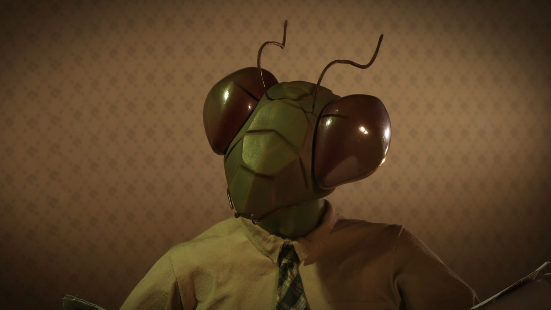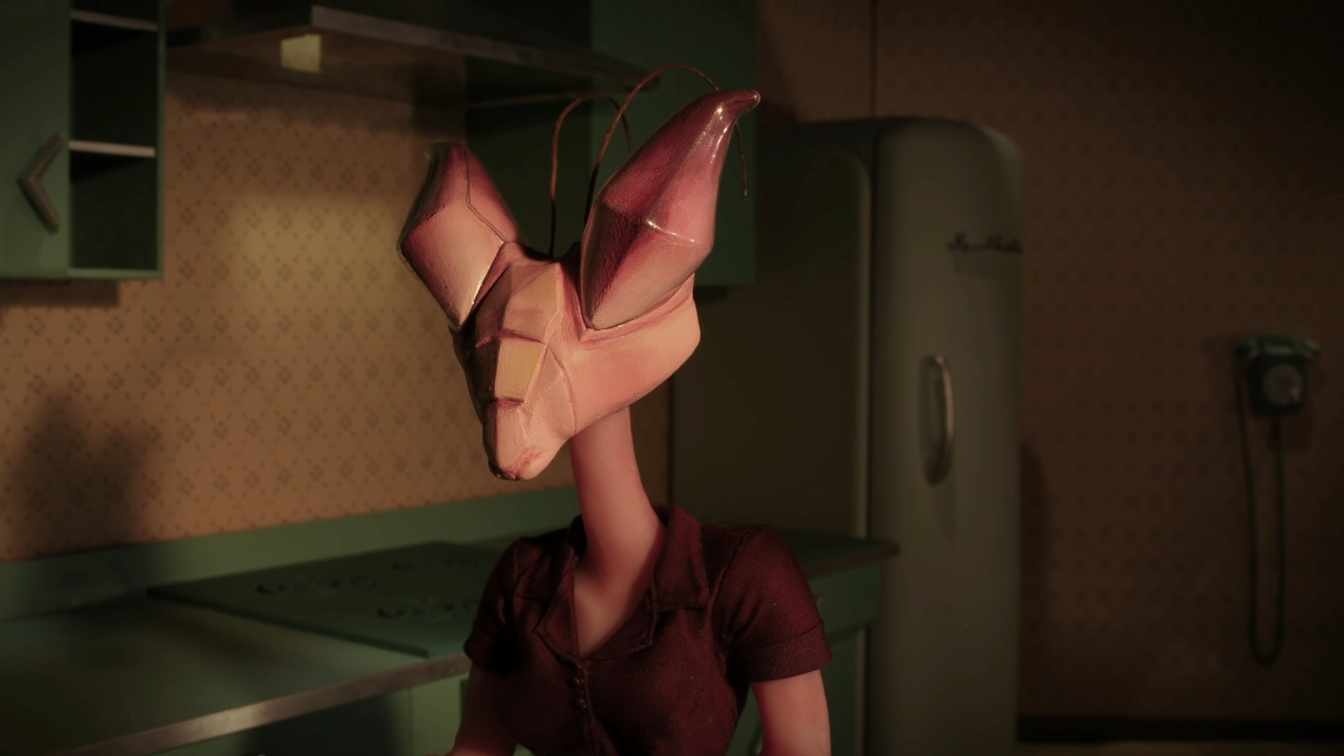 At just over three minutes, Symbiotic wastes no time establishing its distinct visual language. The mantis couple—beautifully fabricated and animated—acts as both metaphor and manifestation, reflecting the protagonist’s internal struggle. The miniature world is rendered with finely crafted sets, hand-built props, and a moody lighting design that accentuates the story’s dreamlike tension.